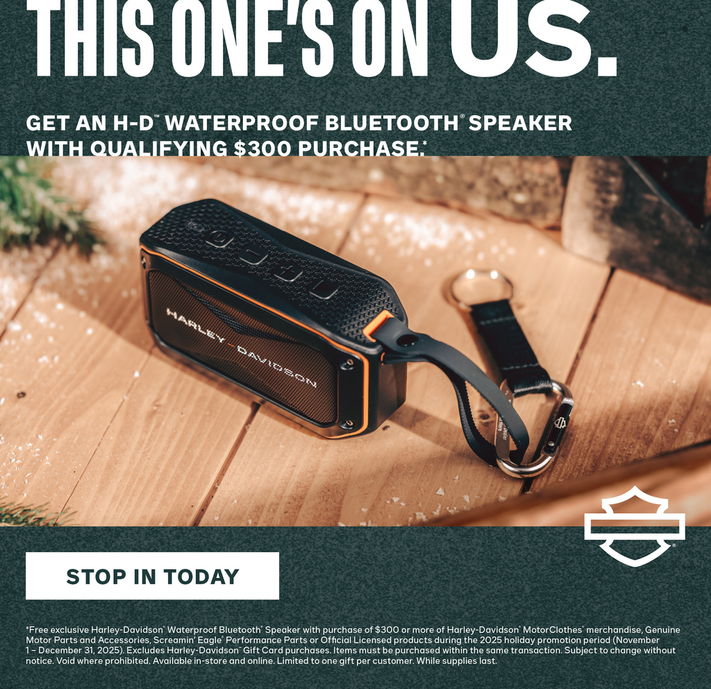 *Free exclusive Harley-Davidson® Waterproof Bluetooth® Speaker with purchase of $300 or more of Harley-Davidson® MotorClothes® merchandise, Genuine Motor Parts and Accessories, Screamin’ Eagle ® Performance Parts or Official Licensed products during the 2025 holiday promotion period (November 1 – December 31, 2025). Excludes Harley-Davidson™ Gift Card purchases. Items must be purchased within the same transaction. Subject to change without notice. Void where prohibited. Available in-store and online. Limited to one gift per customer. While supplies last.